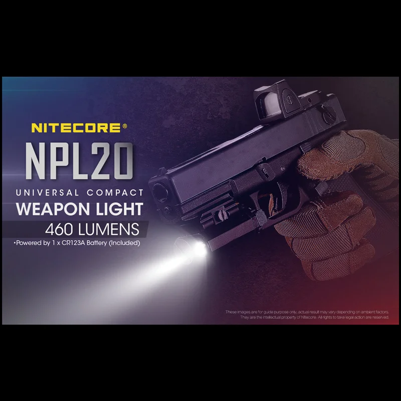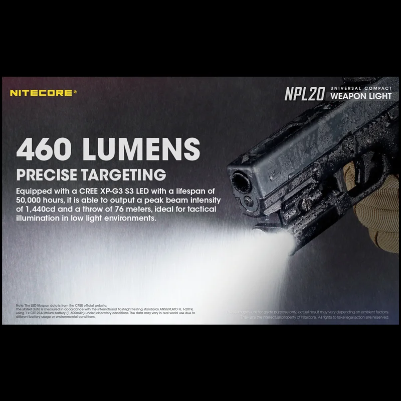 Product Name: Lampu Pistol Taktis NITECORE NPL20 460Lumen CREE XP-G3 S3 LED Dengan Baterai CR123A Lampu Senjata Berburu Luar Ruangan